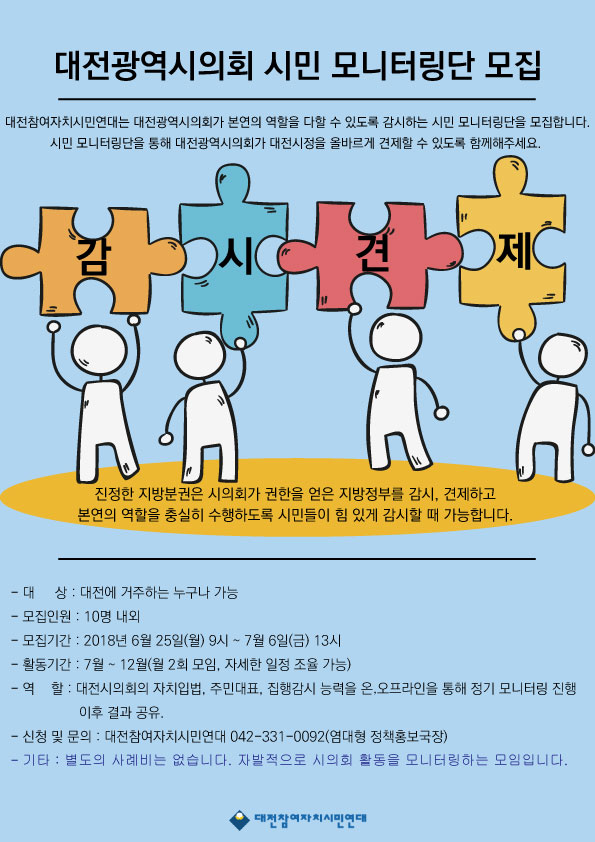 집권여당이 독식한 제8대 대전시의회가 집행부 견제와 비판이란 본연의 역할을 다할 수 있을지 의문이 제기되는 가운데 대전참여자치시민연대가 시민 모니터링단을 모집한다.