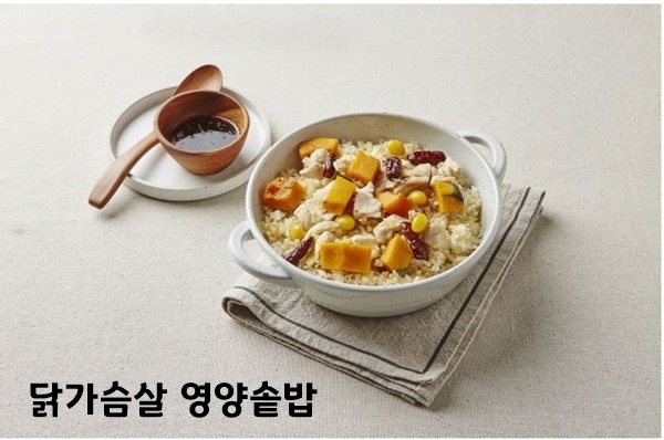 4. 솥에 불린 쌀을 넣고 닭가슴살, 단호박, 대추, 은행을 고루 올린 뒤 밥물(2컵)에 소금(1t)을 섞어 붓는다.