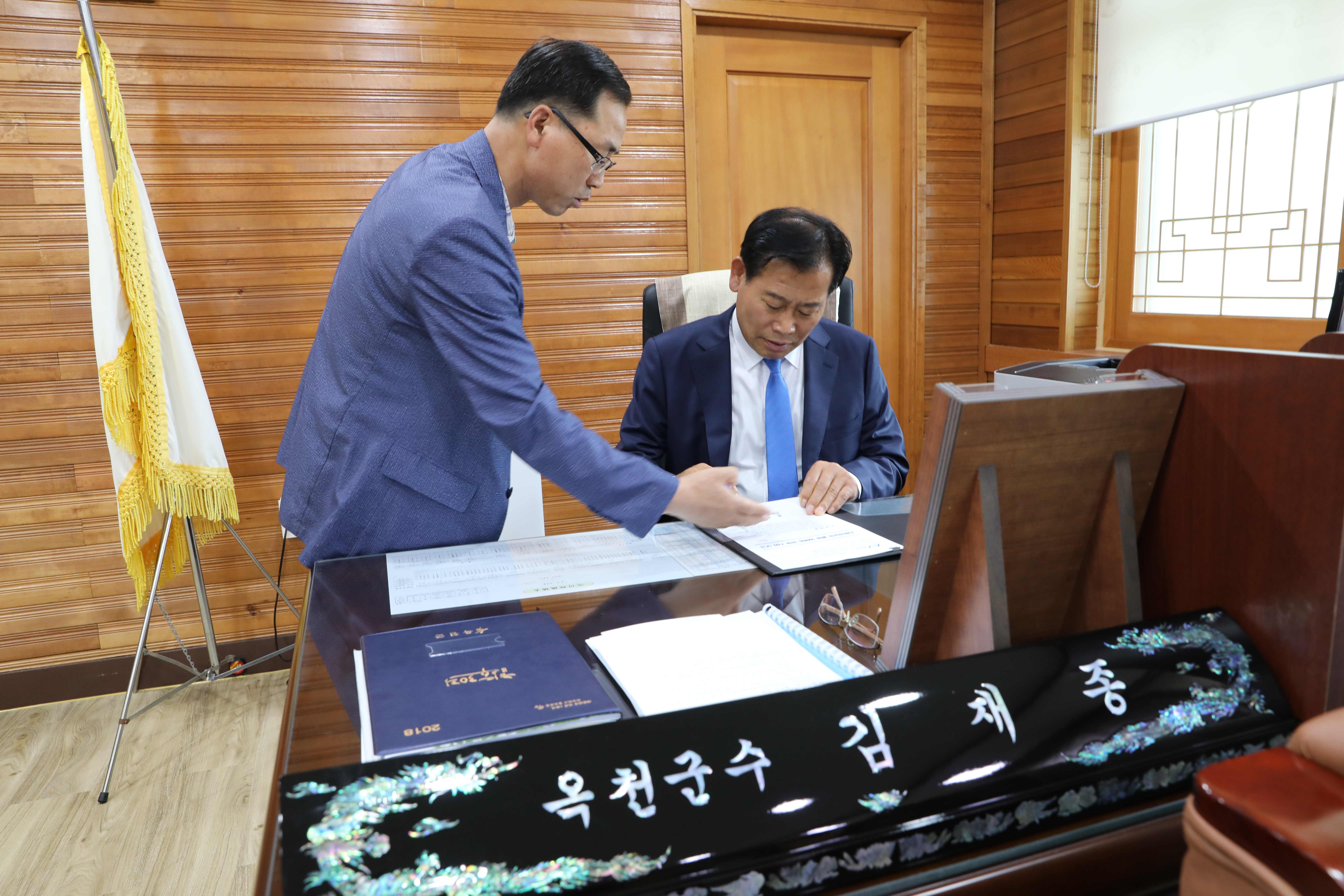 김재종 옥천군수가 지난 2일 취임 후 첫 결재로 ‘친환경농업 방제 지원 계획‘에 서명하고 공식 업무에 들어갔다.