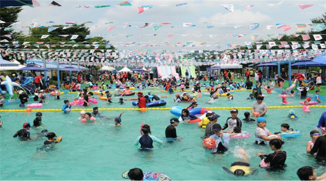 야외수영장은 총 5000㎡에 수영조 2조, 상어 슬라이딩·어리다함께 슬라이딩·독도 바운스를 포함해 테마별 에어바운스 6조와 탈의실·샤워실·화장실 등 다양한 부대시설을 갖췄다.