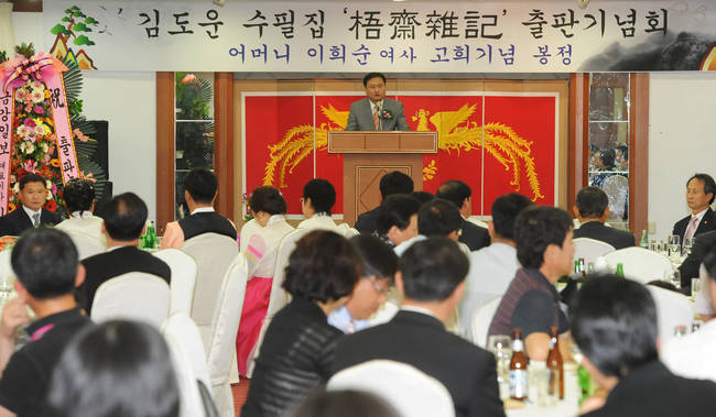 20년 가까운 세월 동안 기자로 살아온 김도운의 눈에 비친 세상은 어떤 모습일까.최근 수필칼럼집‘오재잡기(梧齋雜記)’를 출간한 금강일보 김도운 기자가 25일 대전 유성 계룡스파텔 태극홀에서 출판기념회를 갖고 책을 내게 된 사연을 지인들에게 소개했다.김 기자는 수년 전 역에 얽힌 이야기를 통해 향수를 이끌어 낸 '충청의 역'과 지역 철도의 발전상을 소개한 '미래로 가는 충청철도'를 발간해 책을 만드는 일을 처음 시작했다.그 후엔 충청지역의 저수지에 대한 이야기를 담아낸 ‘충청의 생명수를 찾아서’를 내놓았다. 그리고 올 해 김 기자는 오랜 기자생활을 하는 동안 그의 일상에 적지 않은 영향을 끼쳤던 사람들, 그리고 자신에 대한 솔직한 이야기를 담아 '오재잡기'를 엮어냈다.기자로서 본연의 일에 충실하면서도 책에 대한 열정을 갖고 저술을 게을리 하지 않은 김 기자는 출판기념회장에서 책과 지인을 소개하는 시간에 시종 함박 웃음을 잃지 않았다.출판기념회에는 그가 ‘가족’이라 부르는 금강일보 직원 약 50여 명과 그의 친지들, 업계 관련자 등 총 200여 명이 운집해 대성황을 이뤘다. 금강일보 최일 기자의 사회로 진행된 1부는 저자 및 저서 소개, 각계 인사들의 축사와 격려사, 저자 자신의 인사말 등이 이어졌다.특히 그는 가족들에게도 비밀로 했던 일화를 소개하며 자신이 왜 출판기념회를 할 수밖에 없었는지를 설명해 참석자들에게 한바탕 웃음을 안기기도 했다.김 기자는 인사말에서“경험도 일천하고 생각도 짧은데 책을 낸 것이 부끄럽다”며 “하지만 글을 쓴다는 것은 부끄러움을 극복하는 데서 시작된다는 말을 교훈삼아 부족하지만 책을 내게 됐다”고 설명한 뒤 시종일관 재미있는 이야기로 행사 분위기를 이끌었다. 출판기념회에 이어 가진 2부 행사는 그의 어머니 이희순 여사의 고희연으로 진행됐다.김 기자는 '오재잡기'가 어머니의 칠순에 맞춰 선물로 만들어진 것이라고 참석자들에게 소개하고, 자신이 지은 책을 어머니께 봉정해 박수갈채를 받았다.‘김도운’ 이기에 모인 사람들출판기념회에 김용찬 금강일보 회장과 이광희 사장 등을 비롯해 최준하 충남대학교 교수, 정호 세우리병원 원장과 문학평론가인 리헌석 대전예술단체총연합회장, 노덕일 한국관악협회장, 신경섭 롯데백화점 대전점장, 김만구 대전시건설협회 사무처장, 전제모 대전시레슬링협회장, 충북고와 충남대 동문 등 많은 지인들이 참석해 자리를 빛냈다. 김 기자는 참석한 모든 관계자들과 일일이 악수를 나누며 “지금까지 책을 내며 내게 많은 가르침과 도움을 주신 분들”이라고 소개했다. 김 기자를 오랜 시간 옆에서 지켜보고 배웠다는 권도연 기자는 단상에 올라 저자 소개를 하면서 솔직함과 털털함, 그리고 소박함을 갖췄다고 김 기자를 표현했다. 특히 권 차장은 “주변 사람들의 마음을 잘 이끌어 내 사내에서 뿐만 아니라 기자로서 봐도 인간관계가 참 좋다”며 “마치 지금 맹활약 하고 있는 박지성 같은 매력을 지녔다”고 전했다. 금강일보 이광희 사장은 "김도운 부장은 전 직장에 같이 근무할 때 2년 연속 최우수 기자 상을 받았을 만큼 능력 있는 기자다"라며 "3년 연속 수상자로 결정됐지만 본인이 양보하는 미덕을 보이기도 했다"며 금강일보에서 없어서는 안 될 인물이라고 강조하며 저자를 치켜 세웠다. 은사인 최준하 교수는 “김 기자와는 1988년부터 인연을 맺어 지금까지 정을 나누고 있다. 학창시절을 돌이켜 보면 늘 그의 곁엔 선ㆍ후배가 모여들었다”고 회상하고 "학생 때부터 친화력과 적응력이 뛰어나‘사막에 혼자 떨어뜨려놔도 잘 적응해 살아갈 친구’라고 칭찬했던 기억이 난다"고 말했다. 서평을 위해 사전에 책을 모두 읽고 단상에 오른 리헌석 대전예술단체총연합회장(문학평론가)은“김 기자의 글을 보니 이 사람의 가치, 시각에 절로 고개가 끄덕여진다”며 "문인이 쓰는 수필만큼 감동적이었고 특히 그의 효심을 느끼기에 충분했고, 때로는 사회의 부조리에 대해 신랄한 비판을 가하기도 했다"고 평가했다.책에 대한 열정김도운 기자는 직접 책을 쓰게 된 계기에 대해 “군 복무 때 휴가를 나왔다가 서울의 대형서점에 들렀다가 수만 권은 돼 보이는 책들 앞에서 책을 만들고 싶다는 강한 욕구를 느껴 출판을 결심하게 됐다”며“특히 고희를 맞으신 어머니께 선물하기 위해 어머니의 칠순연에 맞춰 책을 발행하게 됐다"고 소개했다.김 기자는 "철도기관 담당기자를 하며 충청권 역을 소개하는 연중 기획물을 싣게 됐고 이 것을 묶어 생애 첫 번째 책을 만들었다"며 "이후 비슷한 유형의 책을 몇 권 더 만들며 자신감이 생겨 어머니께 바치는 책을 만들게 됐다"고 말했다. 중견 언론인으로 성장한 김 기자의 뒤에는 한평생 그의 뒷바라지에 모든 것을 바치신 그의 어머니가 있었다. 그래서 김 기자는‘오재잡기’의 출판기념회를 어머니의 칠순잔치와 더불어 가졌다. 그는 "어머님의 무병장수를 빌며 이 책을 드린다"며 "아내는 물론 두 아들 영유와 영연이가 훗날 아빠 저술의 애독자가 되주길 바란다”고 끝인사를 했다. ‘기자수첩, 데스크 칼럼’등 김 기자가 언