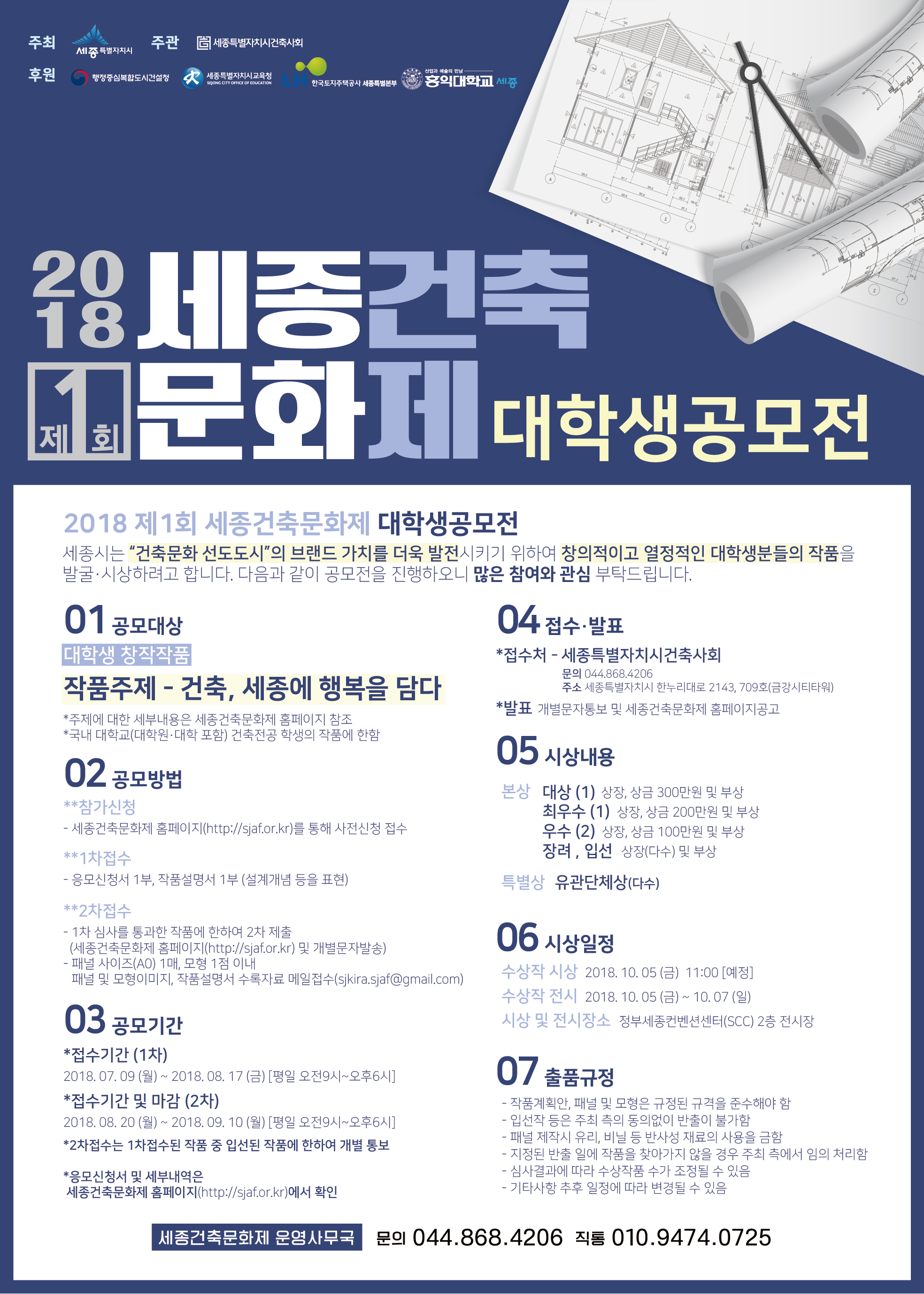 공모 주제는 ‘건축, 세종에 행복을 담다’로 오는 10월 5일 열리는 제1회 세종건축문화제 일환으로 진행된다.