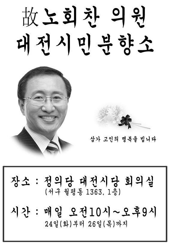 정의당 대전시당은 24일 서구 월평동 시당사에 분향소를 설치, 시당 운영위원 합동분향을 시작으로 조문객을 맞았다. 26일 오후 9시까지 분향소를 운영하는 김윤기 시당 위원장은 “비통한 마음을 금할 길이 없다. 노회찬 원내대표님의 뜻대로, 당이 당당히 앞으로 나아갈 수 있도록 살아가겠다”라며 눈시울을 붉히고, “정의당을 계속 아껴주길 바란다는 고인의 유지(遺志)가 전해졌기 때문인지 입당 및 후원 문의가 이어지고 있다”라고 말했다.