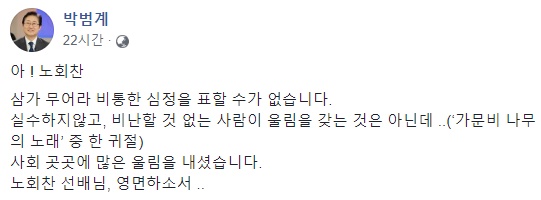 더불어민주당 차기 당 대표에 도전하는 박범계 의원(대전 서구을)은 자신의 페이스북에 “아! 노회찬, 삼가 무어라 비통한 심정을 표할 수가 없습니다. 실수하지 않고, 비난할 것 없는 사람이 울림을 갖는 것은 아닌데…(‘가문비나무의 노래’ 중 한 구절), 사회 곳곳에 많은 울림을 내셨습니다. 노회찬 선배님, 영면하소서…”라는 글을 올려 고인을 애도했다.