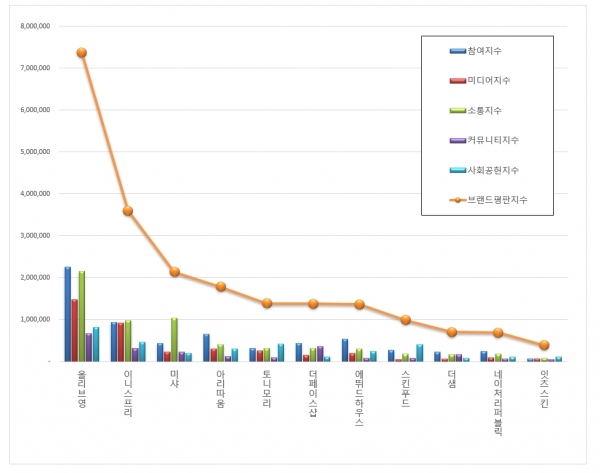 1위, 올리브영 브랜드는 참여지수 2,258,360 미디어지수 1,473,152 소통지수 2,147,508 커뮤니티지수 664,889 사회공헌지수 819,400가 되면서 브랜드평판지수 7,363,309가 되었다. 지난 6월 브랜드평판지수 6,498,757와 비교하면 13.30% 상승했다.