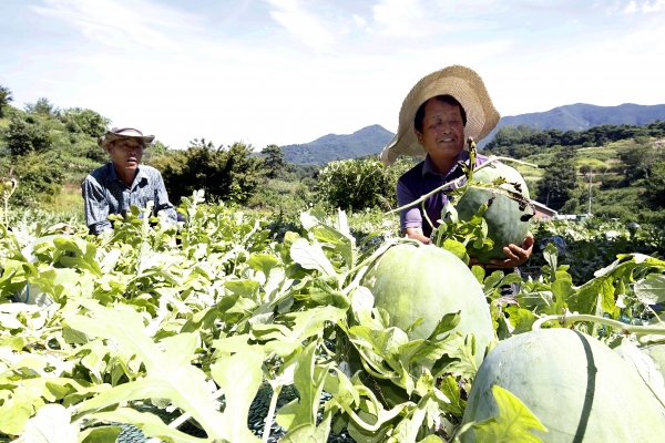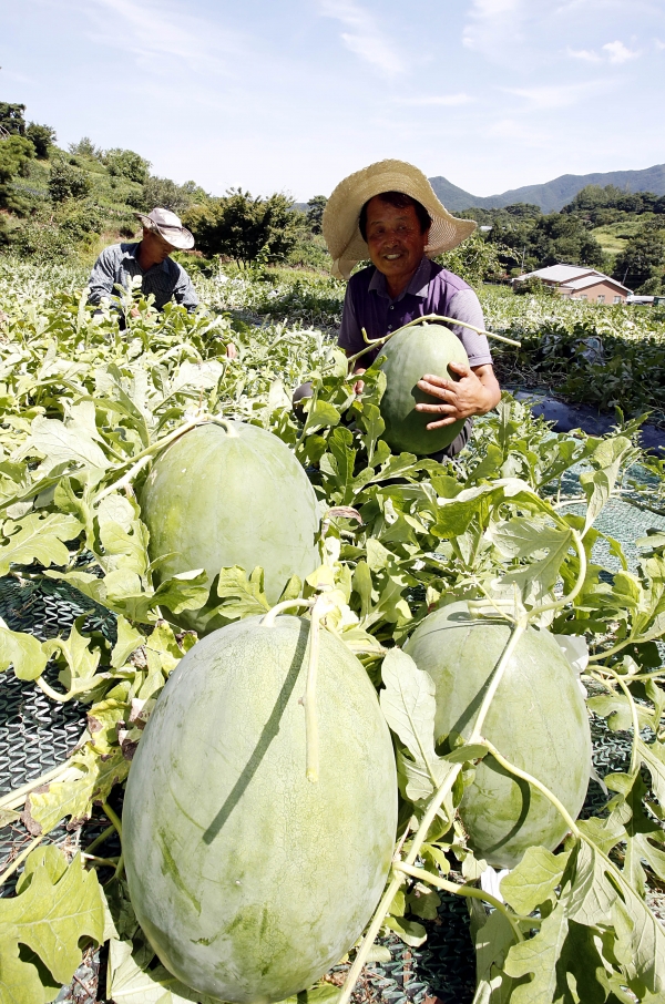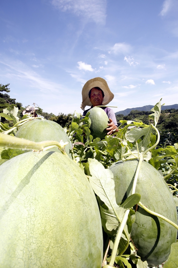 지난 14일 오전 광주 북구 금곡동 무등산수박 정보화마을 농경지에서 농민이 '푸랭이'라고 불리는 무등산수박을 수확하고 있다. 광주 대표 특산물인 무등산 수박은 오늘(15)일부터 금곡동 공동직판장에서 판매되고 있다. 광주 북구청 제공