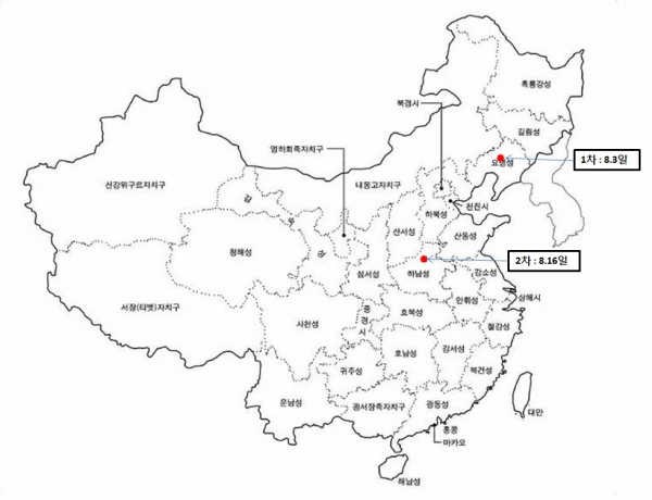 중국 농업농촌부는 금번 발생이 중국 내 두 번째 아프리카돼지열병 발생사례로 하남성 도축장에서 8월14일 260두 중 30두 폐사가 확인되어 정밀검사를 실시한 결과, 아프리카돼지열병으로 8월16일 확진되었다고 밝혔다.