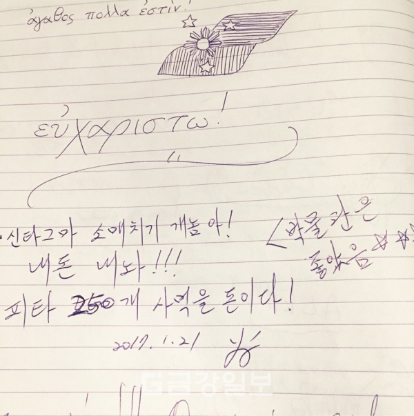 그리스 국립고고학 박물관에 갔다가 우연히 방명록을 봤다. 볼펜을 두고 서둘러 나서는 글쓴이의 뒷모습도 나는 보았다. 가만 보니 한글이다.
