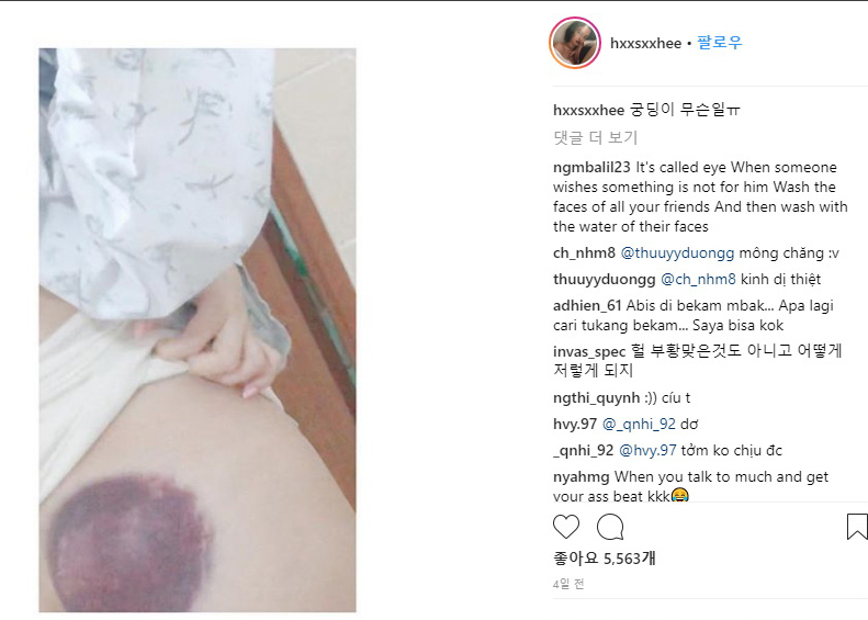 엉덩이에 피멍이 든 의문의 사진을 올렸던 YG 연습생 출신 페미니스트 한서희가 SNS를 통해 퇴원소식을 전했다.