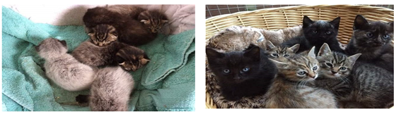 그리고 다음 주가 되자 덮여있던 회색 털들이 점차 사라졌습니다. 이들은 각각 검정색 2마리, 토티스(Tortoiseshell) 무늬 3마리 그리고 태비 무늬 1마리의 고양이로 변했습니다.