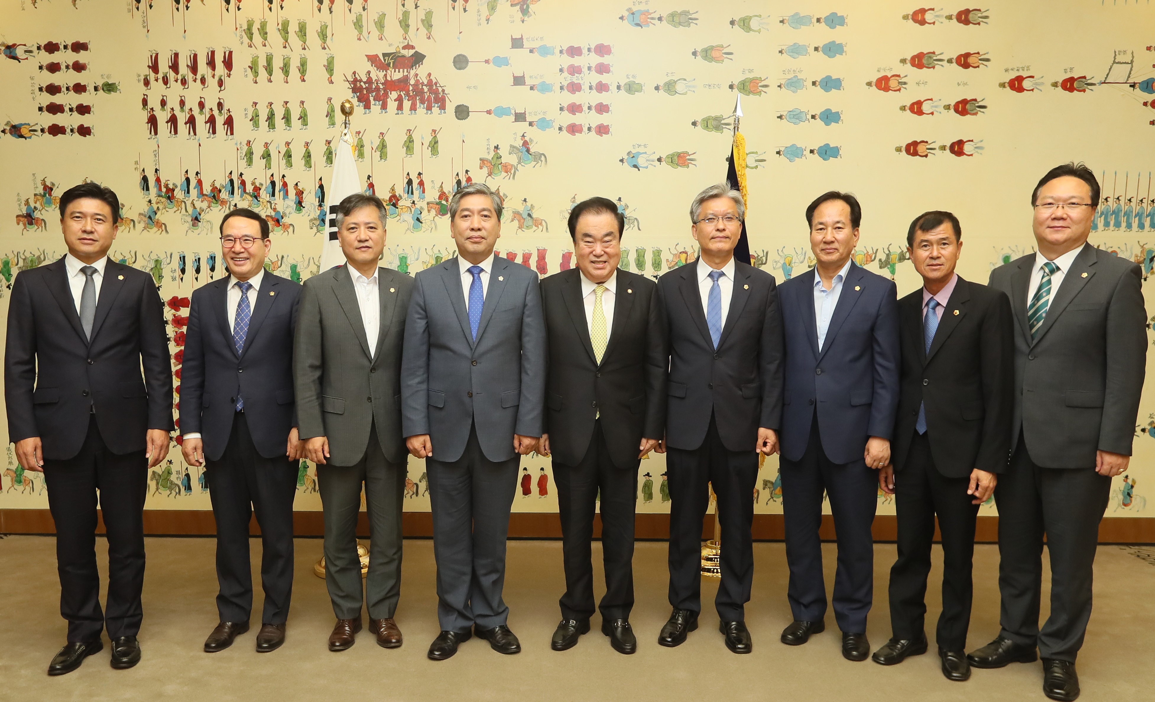 전국시·도의회의장협의회 부회장인 김종천 대전시의회 의장(맨 왼쪽)과 사무총장인 유병국 충남도의회 의장(맨 오른쪽)을 비롯한 협의회 임원진은 지난 4일 국회를 방문, 문희상 국회의장(가운데)과 간담회를 갖고 지방분권형 개헌 및 지방의회의 독립성·전문성 강화를 위한 제도 개선 방안(인사권 독립, 자치입법권 강화, 정책지원 전문인력 도입 등)에 관해 의견을 나눴다. 대전시의회 제공