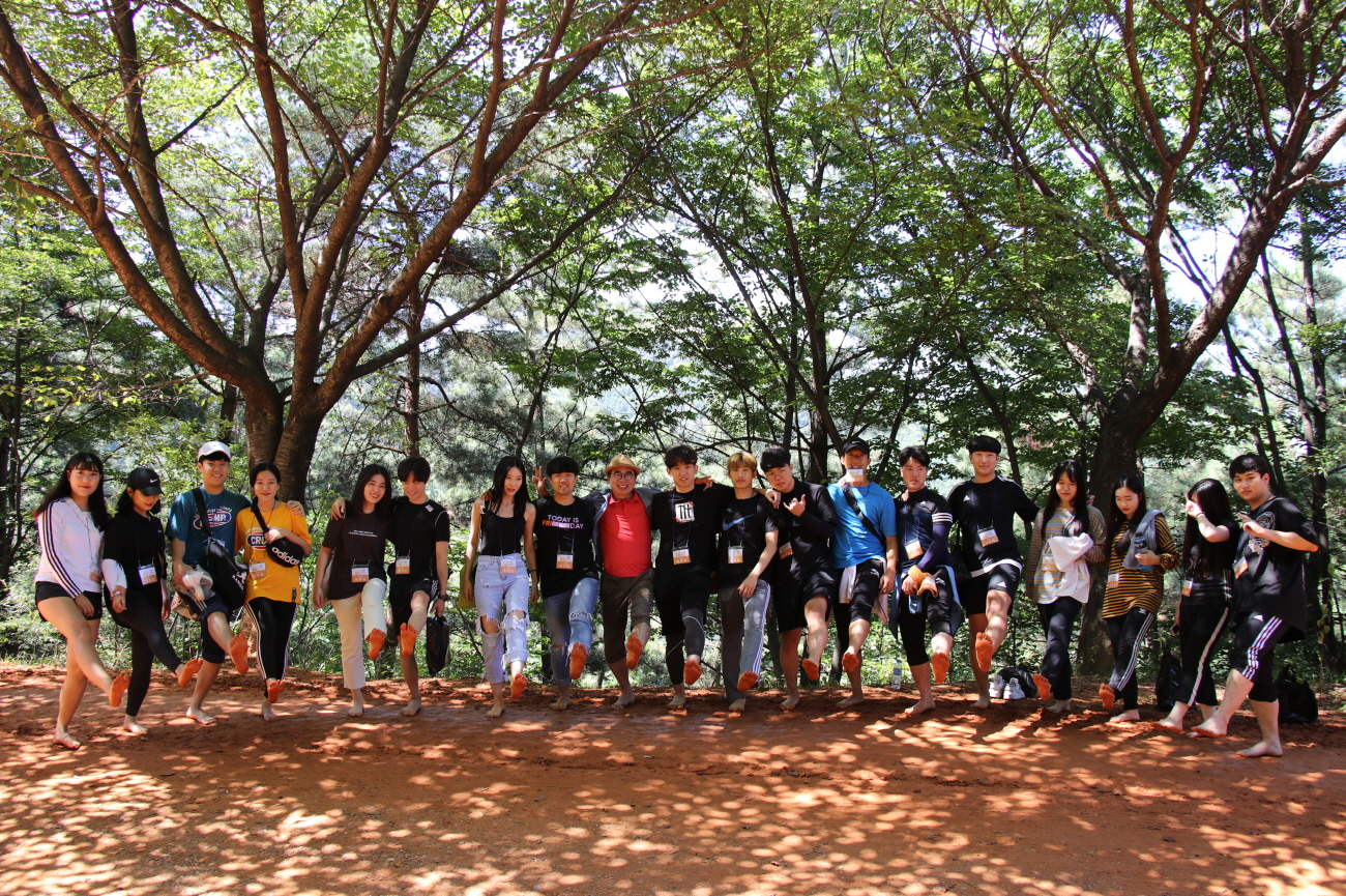 맥키스컴퍼니가 지난 9일 계족산 황톳길에서 대학생 청춘 트레킹 행사를 가진 가운데 참가자들이 기념촬영을 하고 있다. 대전지역 대학생과 조웅래 회장이 함께 계족산황톳길 14.5㎞를 걷는 ‘맨발 트레킹’과 계족산 숲속음악회 ‘뻔뻔(fun fun)한 클래식’을 관람하는 스킨십 프로그램인 이날 행사엔 20여 명의 대학생 참가, 색다른 트레킹의 즐거움을 느꼈다. 맥키스컴퍼니 제공