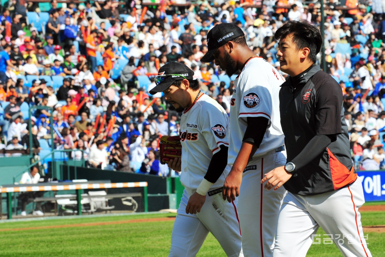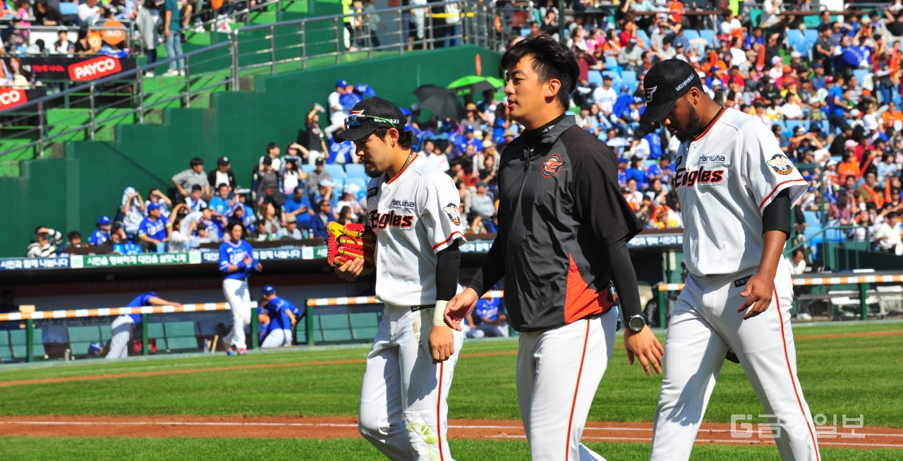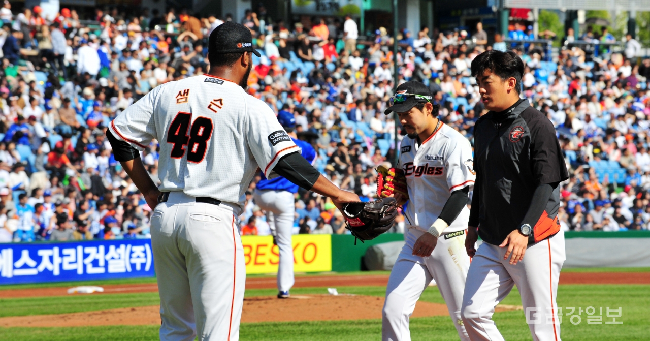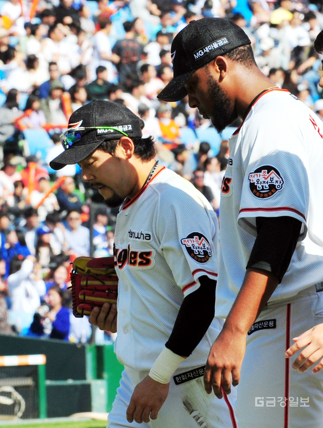 2018신한은행 MY CAR KBO리그 한화이글스와 삼성라이온즈와의 경기가 26일 대전 한화생명이글스파크에서 열려 2회초 삼성 김상수의 안타성 타구를 한화이글스 이용규의 호수비로 실점을 만회한 샘슨이 고마움의 표시를 하고 있다. 전우용 기자 yongdsc@ggilbo.com