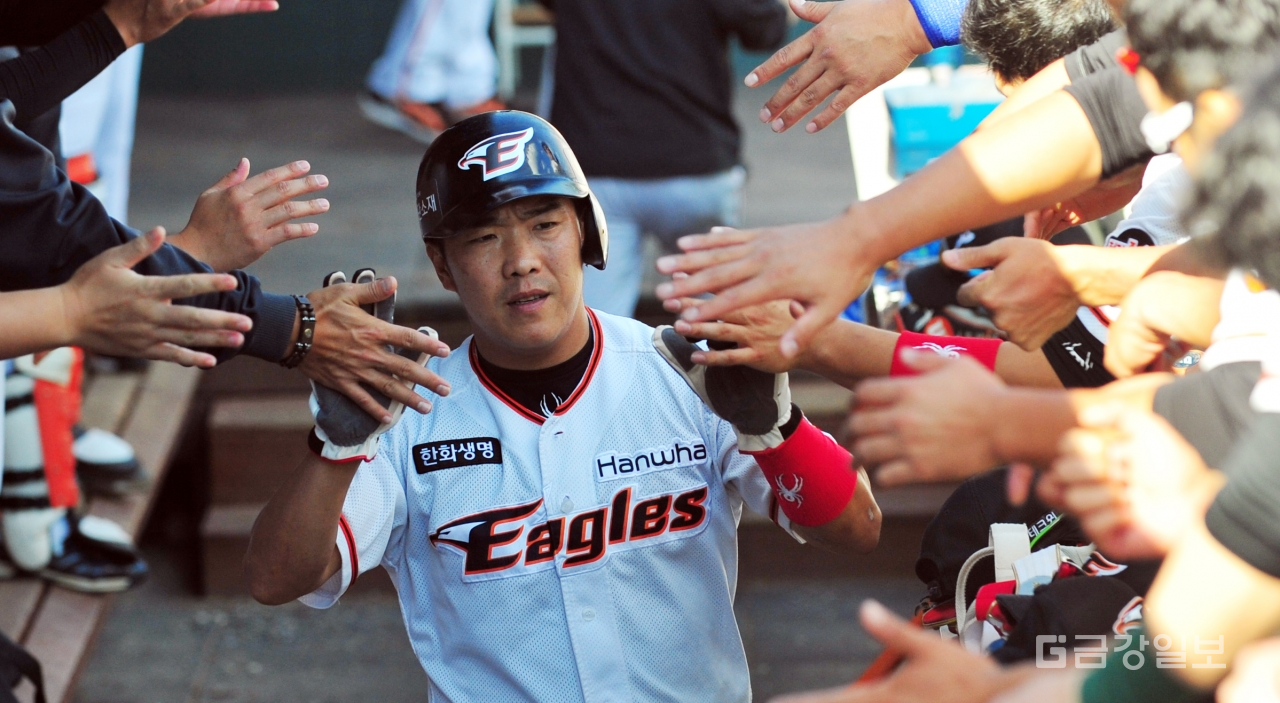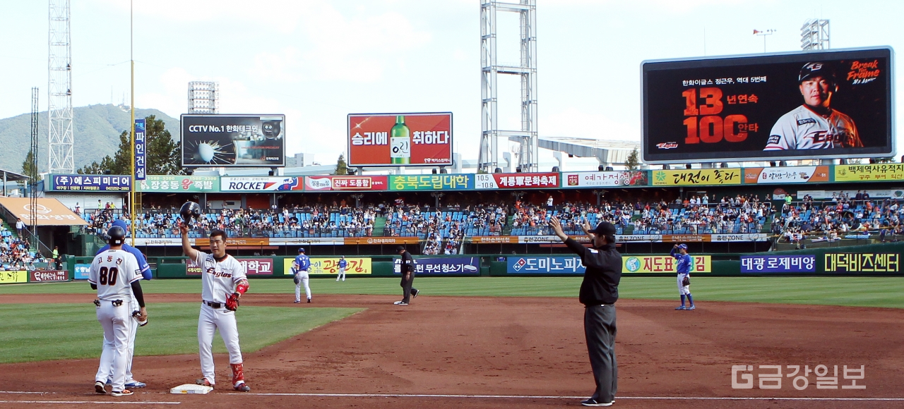 2018신한은행 MY CAR KBO리그 한화이글스와 삼성라이온즈와의 경기가 26일 대전 한화생명이글스파크에서 열려 3회말 한화이글스 정근우가 역대 5번째 13년 연속 100안타를 기록하며 관중들에게 손을 들어 답례하고 있다. 전우용 기자 yongdsc@ggilbo.com