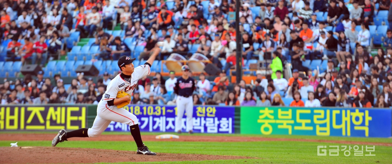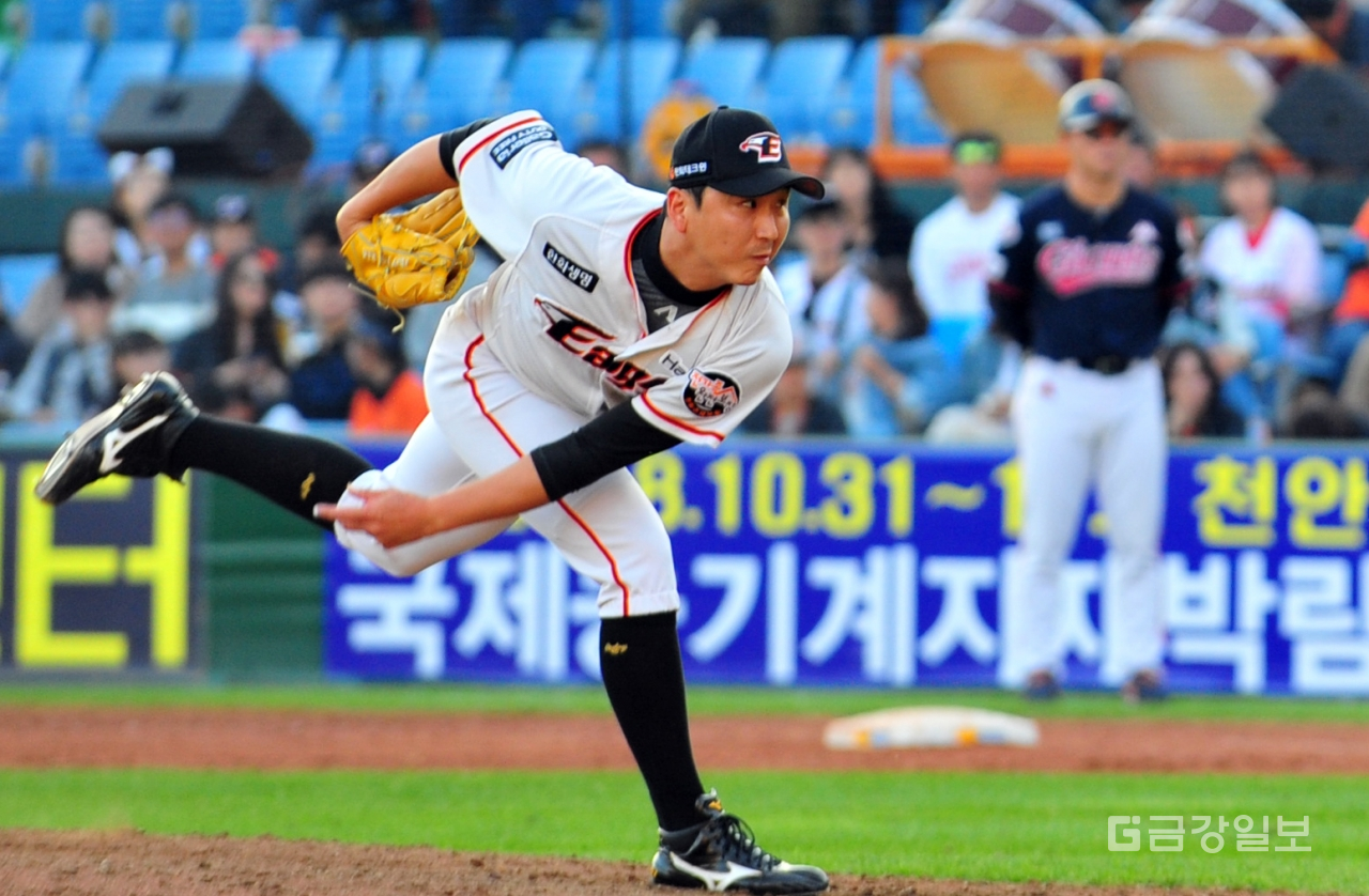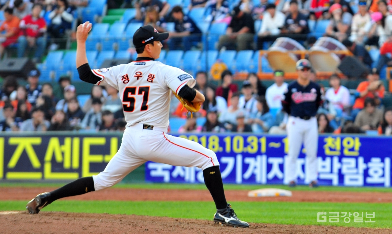 2018 신한은행 MYCAR KBO리그 한화이글스와 롯데자이언츠와의 경기가 3일 대전 한화생명이글스파크에서 열려 9회초 마무리로 나온 한화이글스 정우람이 역투하고 있다. 전우용 기자 yongdsc@ggilbo.com