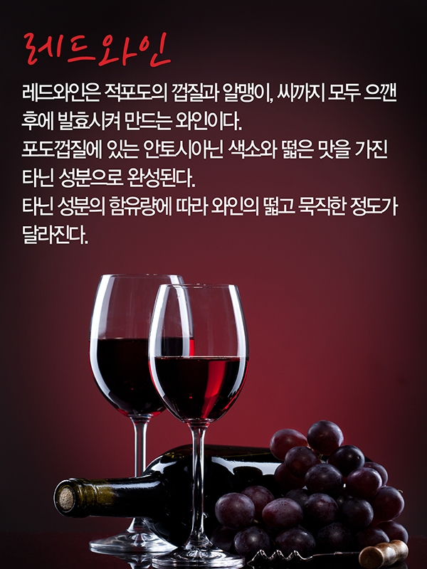 레드와인은 적포도의 껍질과 알맹이, 씨까지 모두 으깬 후에 발효시켜 만드는 와인이다.