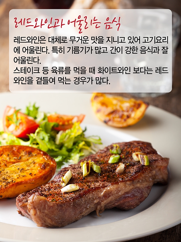 스테이크 등 육류를 먹을 때 화이트와인 보다는 레드와인을 곁들여 먹는 경우가 많다.