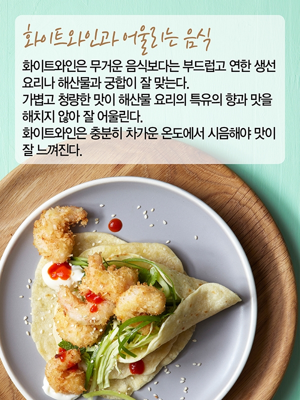 화이트와인은 무거운 음식보다는 부드럽고 연한 생선요리나 해산물과 궁합이 잘 맞는다.