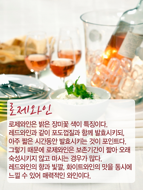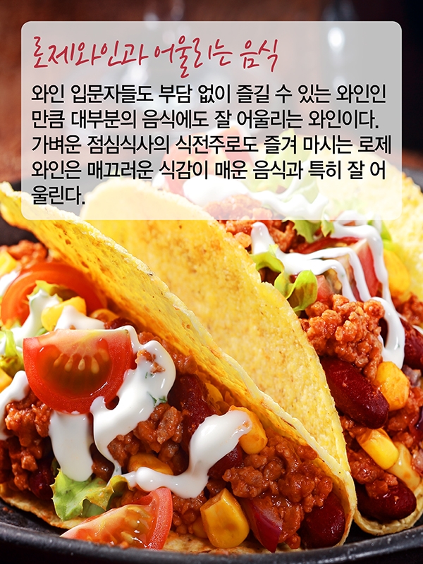 가벼운 점심식사의 식전주로도 즐겨 마시는 로제와인은 매끄러운 식감이 매운 음식과 특히 잘 어울린다.