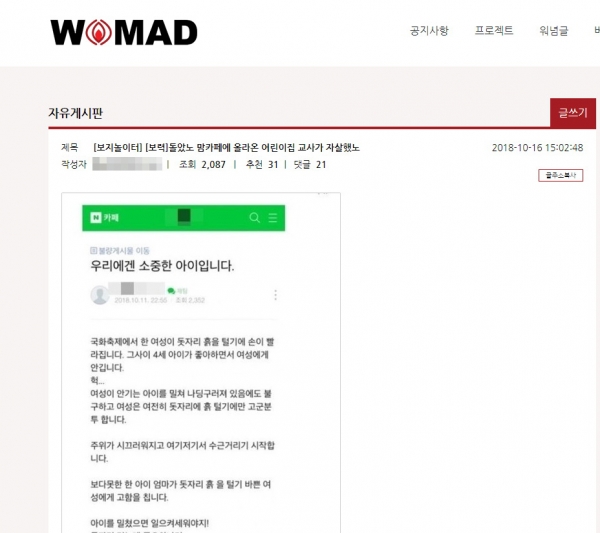 여성우월주의 사이트 워마드가 갑질로 인해 보육교사를 자살에 이르게 한 '김포 맘카페 사건'을 두둔하고 나섰다. 맘카페 여성들의 과도한 행태를 비판하는 여론이 들끓자 불편한 심기를 드러낸 것이다.