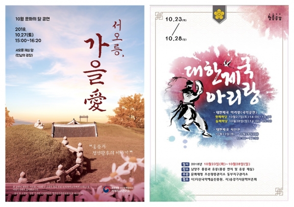 동부지구관리소는 10월 23일부터 28일까지 남양주 홍릉과 유릉(사적 제207호, 홍릉-고종과 명성황후, 유릉-순종과 순명황후‧순정황후)에서 『왕릉공감- 대한제국 아리랑』 행사를 개최한다.