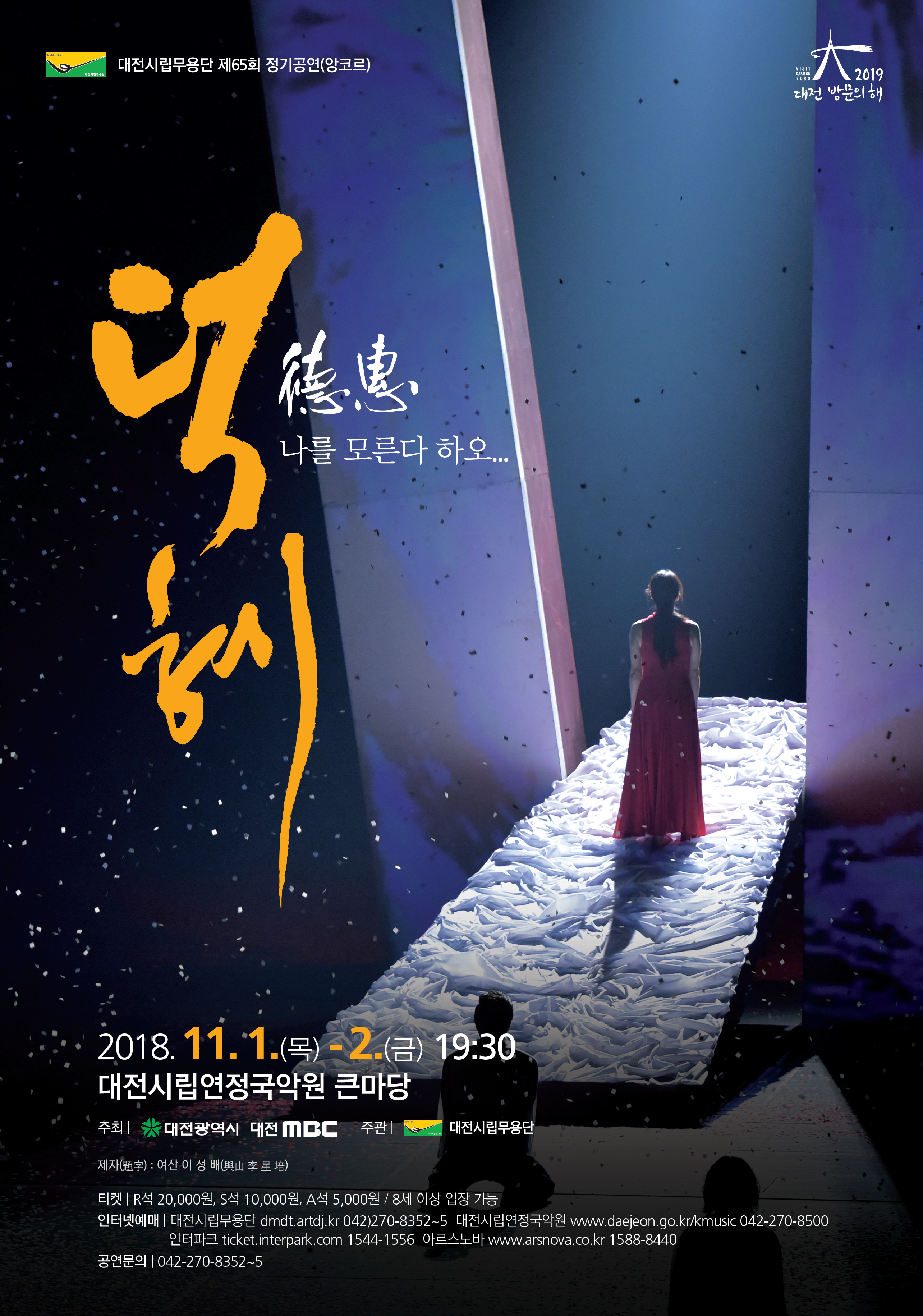 대전시립무용단이 오는 1일과 2일 오후 7시 30분 대전시립연정국악원 큰마당에서 제65회 정기공연 ‘덕혜’ 앙코르 공연을 무대에 올린다. 앙코르 공연 ‘덕혜’는 망국의 옹주(翁主)로 태어나 눈물과 회한으로 생을 마감했던 민족의 슬픈 역사를 춤으로 표현됐다.