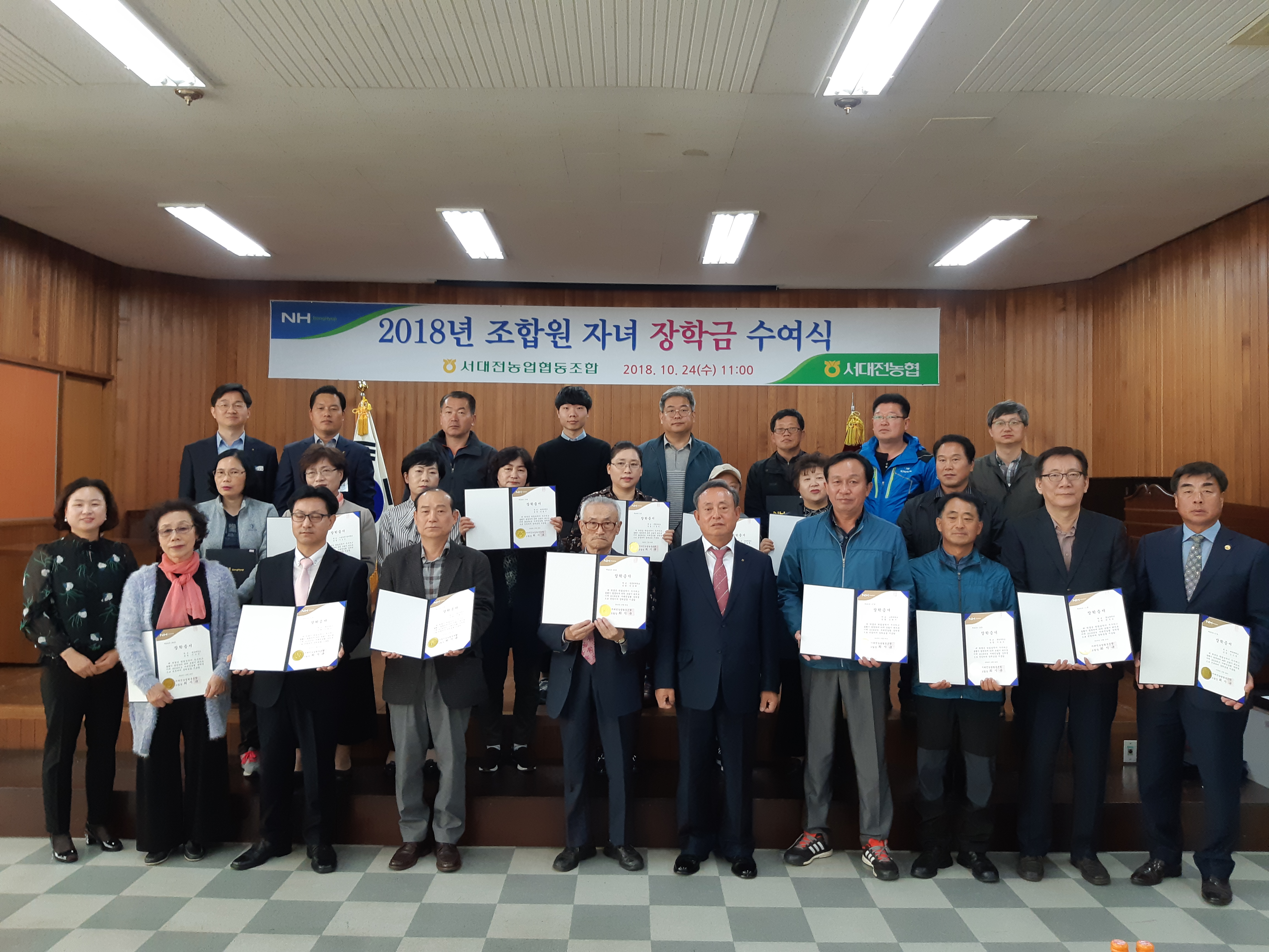 최시규 서대전농협 조합장(첫 번째줄 다섯 번 째)이 24일 대전 유천동 본점 대회의실에서 농업인 자녀 37명에게 1인당 100만 원씩 모두 3700만 원의 장학금을 전달한 뒤 기념 촬영을 하고 있다.
