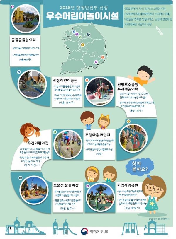 행정안전부(장관 김부겸)는 안전한 어린이 놀이시설의 확산을 장려하기 위해 울산 선암호수공원 등 7개 어린이 놀이터를 ‘2018년 우수 어린이놀이시설’로 선정했다.