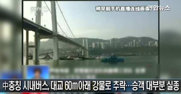 사고는 지난 28일 중국 충칭시 창장2교에서 시내버스가 중앙선을 넘어 마주오던 승용차와 충돌해 대교 60m 아래로 떨어지며 실종, 사망자를 낳았다.