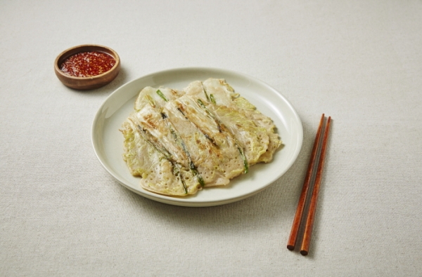 3. 중간 불로 달군 팬에 식용유를 두르고 반죽을 입힌 배춧잎과 쪽파를 올린뒤 남은 반죽을 살짝만 더 끼얹어 앞뒤로 노릇하게 굽는다.