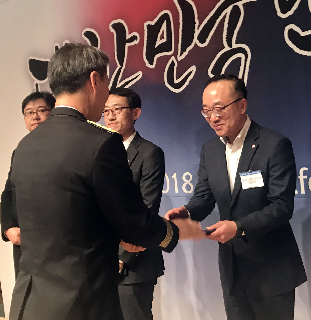 지난 16일 서울 중구 한국프레스센터에서 소방청과 한국안전인증원이 주최한 ‘제17회 대한민국 안전대상’이 개최된 가운데 차창용 롯데아울렛 청주점장(오른쪽)이 공로를 인정받아 우수기업으로 선정돼 조종묵 소방청장으로부터 소방청장상을 수상하고 있다. 롯데쇼핑 제공
