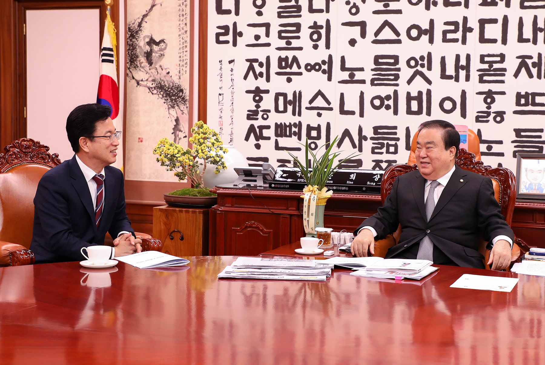 허태정 대전시장(왼쪽)이 21일 국회를 찾아 문희상 국회의장과 면담하면서 대덕특구 리노베이션 마스터플랜 수입, 라온바이오융합의학연구원 설립, 혁신창업 대전스타트업파크 조성사업 등 지역 현안사업에 대한 국비 지원을 요청하고 있다. 허 시장은 이날 이해찬 더불어민주당 대표도 만나 현안사업을 설명했다. 대전시 제공