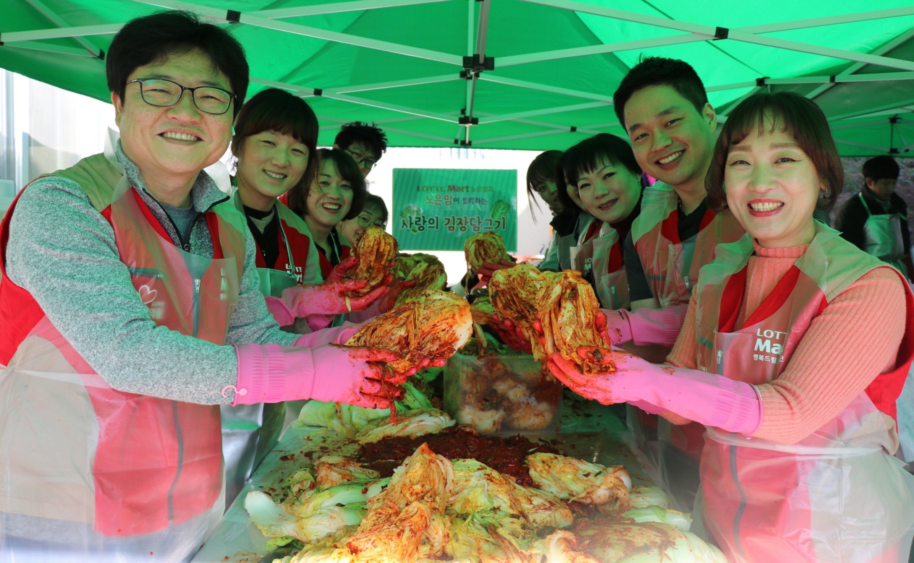 롯데마트 노은점 샤롯데봉사단이 지난달 30일 육아커뮤니티 카페인 ‘노은맘’ 회원들과 함께 대전 유성구에 위치한 아동복지시설 천양원을 방문해 ‘사랑의 김장 담그기 봉사활동’을 펼치고 있다. 올해로 8년째를 맞는 이번 김장 행사는 천양원 아동들의 따뜻한 겨울나기 준비를 돕기 위해 마련됐으며 절임배추 400여 포기와 김장준비 용품 등을 지원했다. 롯데쇼핑 제공