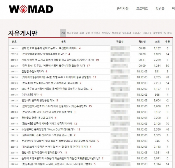최근 워마드 자유게시판에는 최근 대부분의 게시글에 내용과 관계 없이 '박근혜 복권', '문재인 탄핵' 머릿말이 달리고 있다.