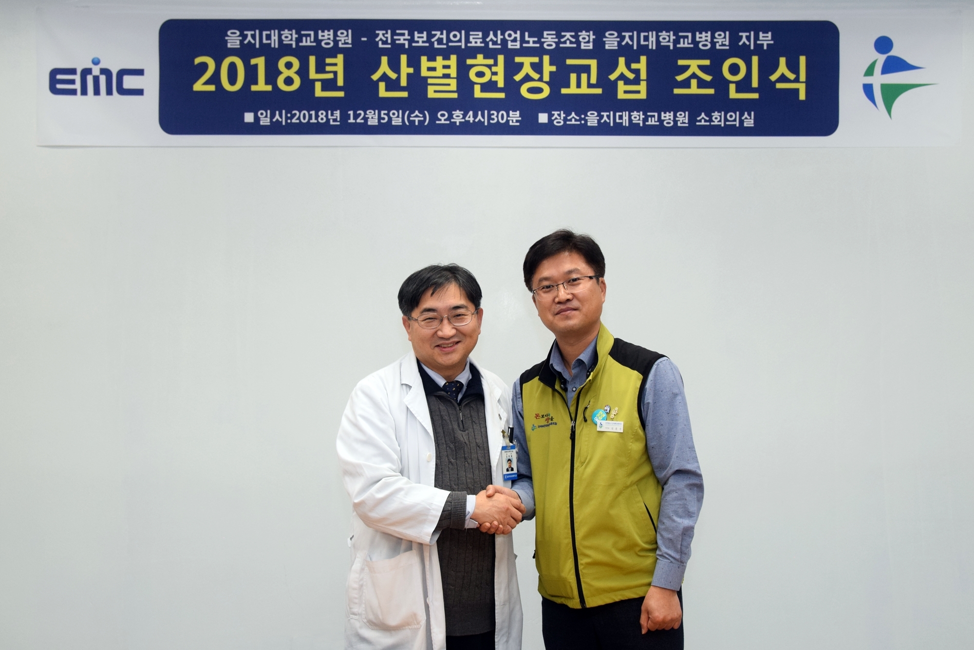 을지대병원이 2018년 임금총액 대비 11.28%를 인상키로 노조와 최종 합의했다. 을지대병원은 5일 오후 4시 30분 병원 2층 소회의실에서 김하용 원장, 신문수 지부장 등 관계자들이 참석한 가운데 2018년 산별현장교섭 조인식을 가졌다.