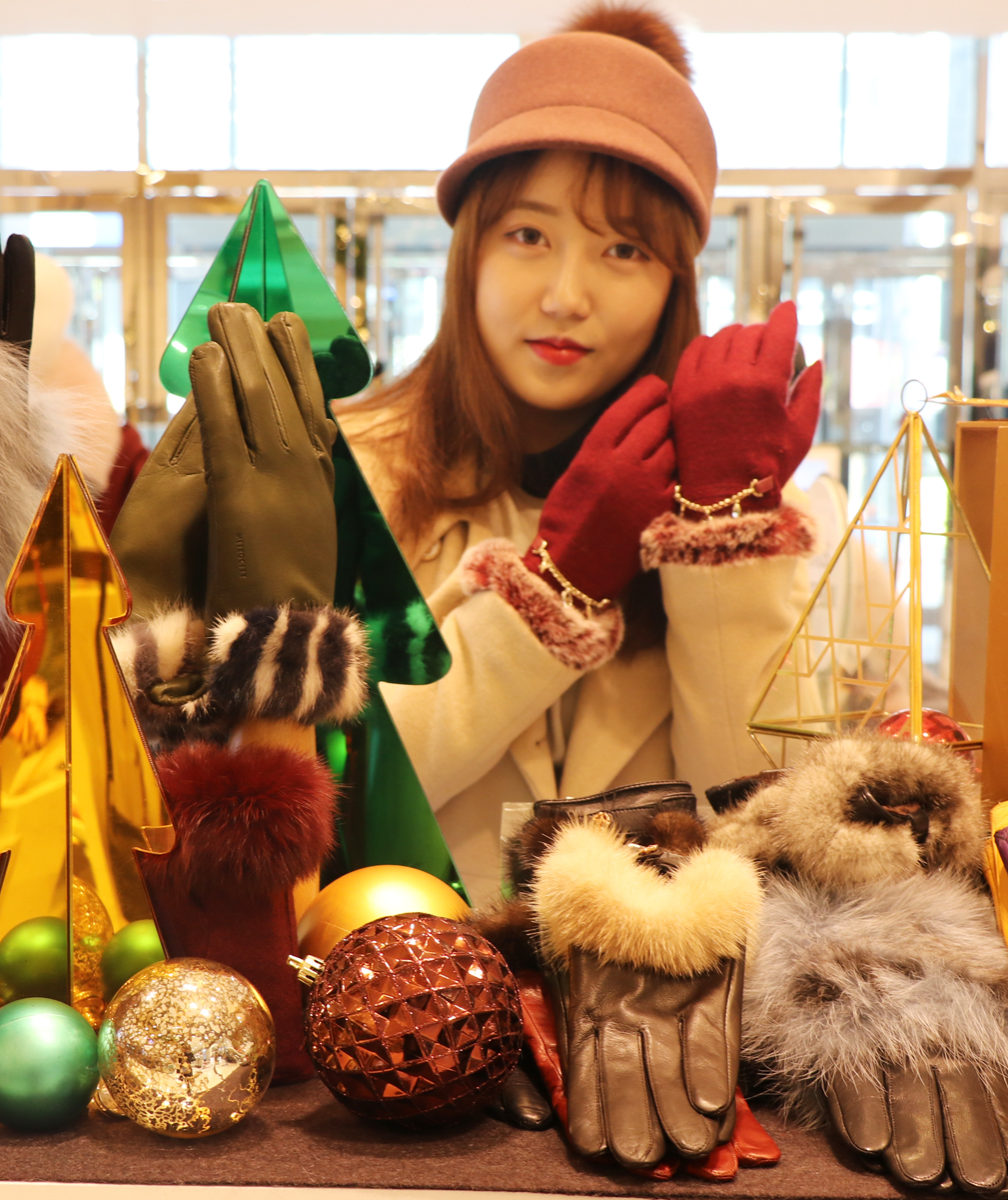 롯데백화점 대전점 직원이 1층 패션잡화 ‘파이너스 뮤지엄’ 매장에서 방한 아이템으로 인기 있는 퍼장갑을 선보이고 있다. 퍼장식으로 손목이나 손등을 감싸 보온성을 높인 ‘퍼장갑’은 화려한 컬러로 스타일을 더욱 돋보이게 하는 연출이 가능하다. 가격은 모, 스웨이드, 양가죽 등 소재에 따라 3만 원대부터 만나 볼 수 있다. 롯데쇼핑 제공