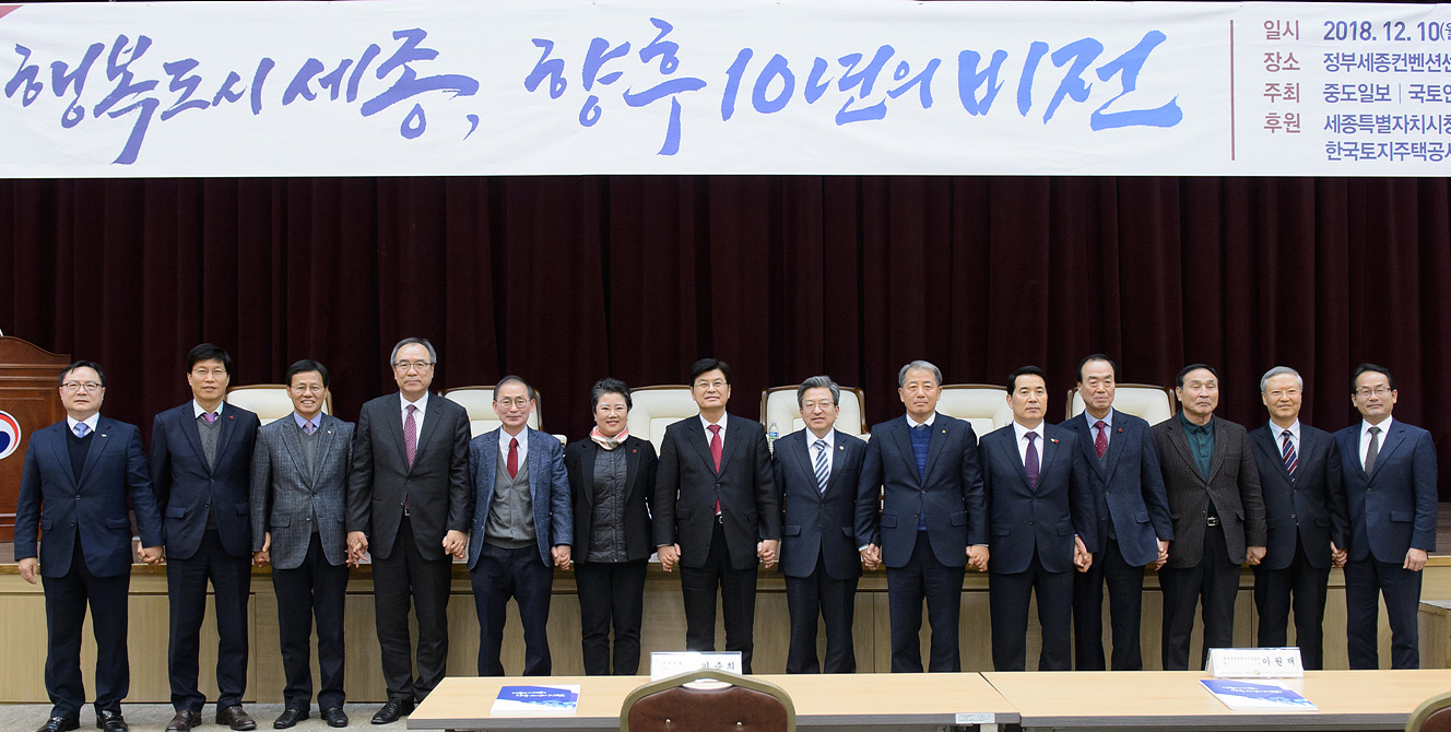 행복도시 건설 10년을 점검하고 향후 행복도시가 나아가야 할 역할을 제시하는 ‘행복도시 세종, 향후 10년의 비전’ 세미나가 10일 정부세종컨벤션센터에서 열려 이춘희 세종시장을 비롯한 패널들이 세미나에 앞서 기념촬영을 하고 있다.