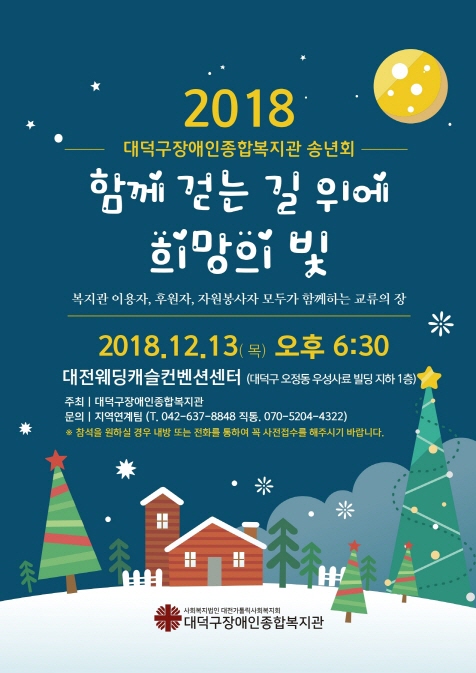 ▲ 대덕구장애인종합복지관 ‘2018 송년회-함께 걷는 길 위에 희망의 빛’=12월 13일 오후 6시 30분, 대전 대덕구 오정동 웨딩캐슬컨벤션센터 ☎042-637-8848