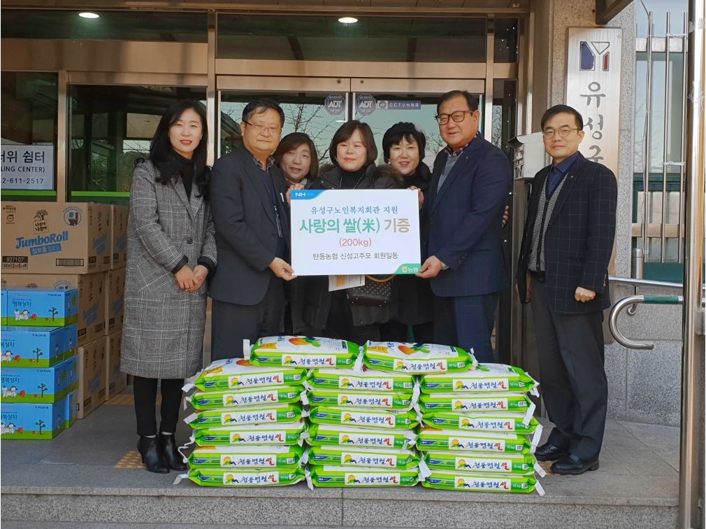 지난 14일 대전 유성구노인복지회관에서 ‘사랑의 쌀 기증 증정식’이 열린 가운데 이병열 대전 탄동농협 조합장(오른쪽 두 번째)과 탄동농협 신성고주모(고향을 생각하는 모임)회원들이 연말연시 노인분들께서 따뜻하게 지내실 수 있도록 쌀 200㎏을 전달하고 있다. 농협중앙회 대전지역본부 제공