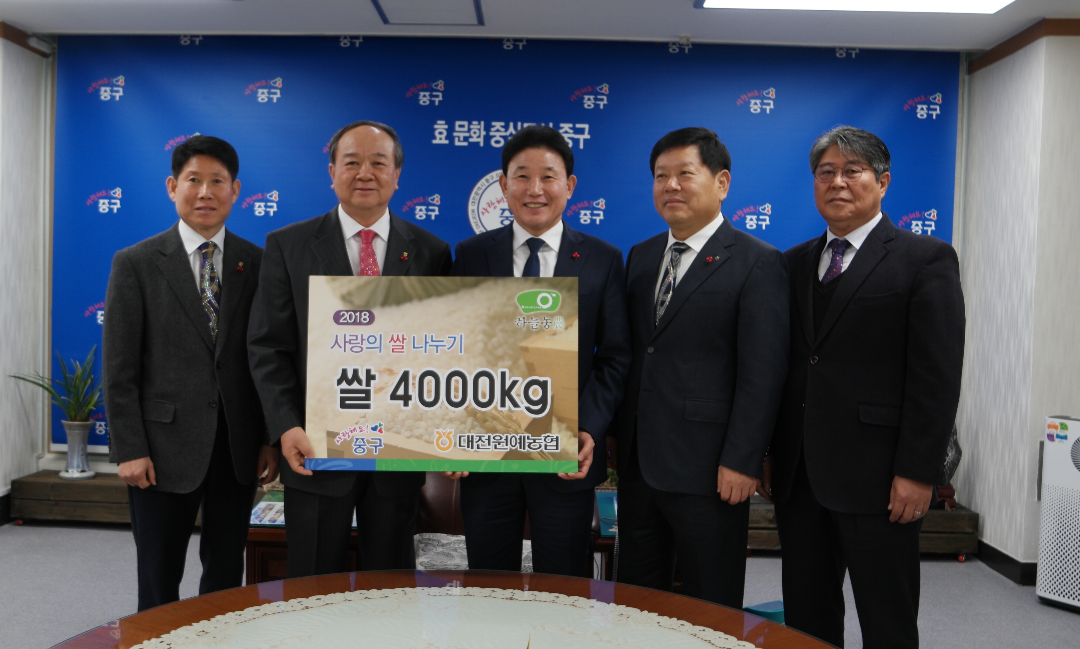 김의영 대전원예농협 조합장(왼쪽 두 번째)이 20일 대전 중구청에서 어려운 이웃들이 따뜻한 겨울을 보낼 수 있도록 1000만 원 상당의 백미 4000㎏을 기탁하고 있다. 대전원예농협은 지난 2006년부터 지역사회의 어려운 이웃을 위해 김장 및 사랑의 쌀 나누기 사업을 매해 꾸준히 실천해 오고 있다. 농협중앙회 대전지역본부 제공