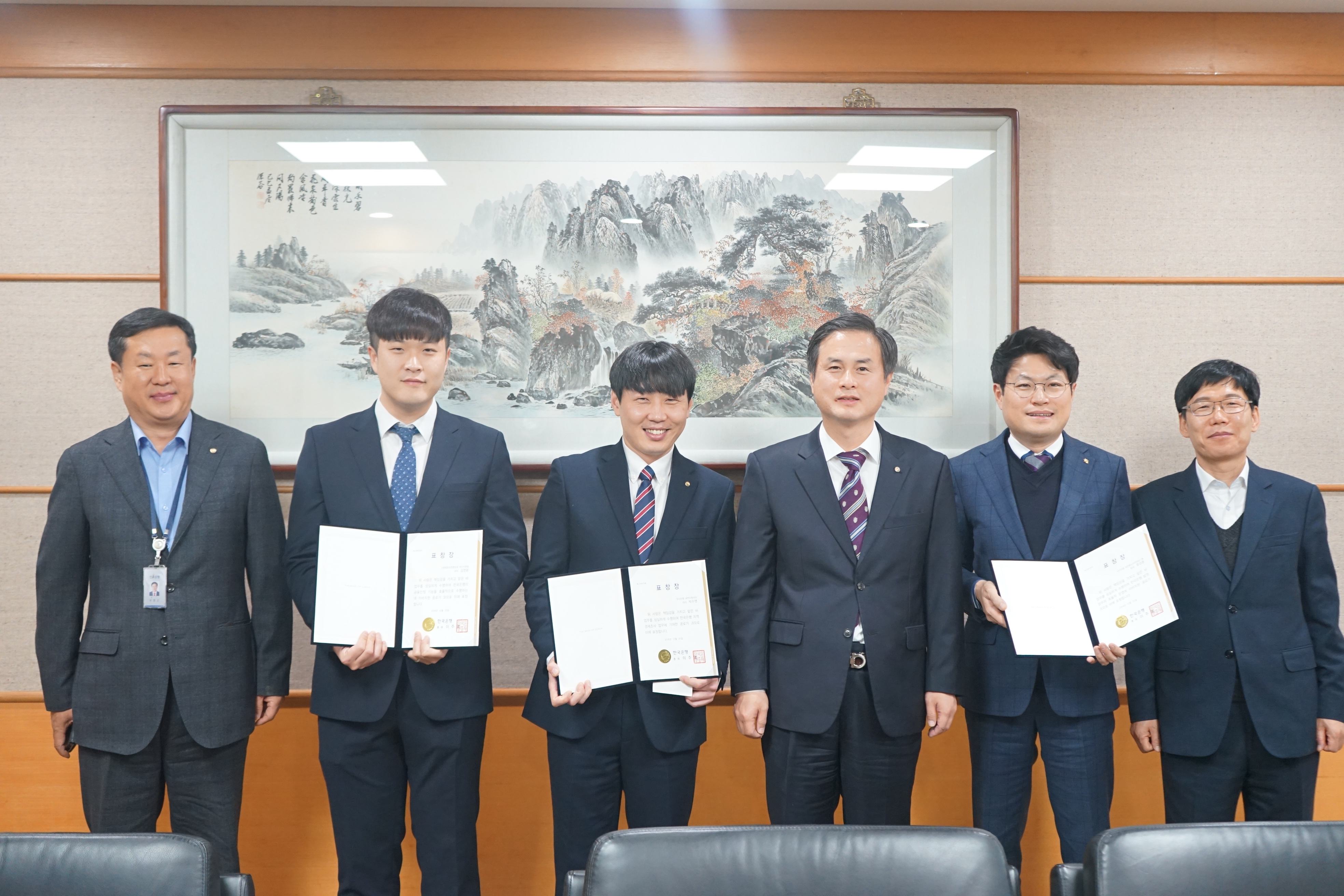 한국은행 대전충남본부가 20일 본부에서 한국은행 업무수행에 기여한 개인에 대해 한국은행 총재 표창장과 부상을 수여한 가운데 수상자인 김영환 신협협동조합중앙회 대리(왼쪽 두 번째), 박수영 우리은행 대전지원센터 대리(왼쪽 세 번째), 류성훈 국민은행 대전충남지역 영업그룹 팀장(오른쪽 두 번째) 등이 기념촬영을 하고 있다. 한국은행 대전충남본부 제공