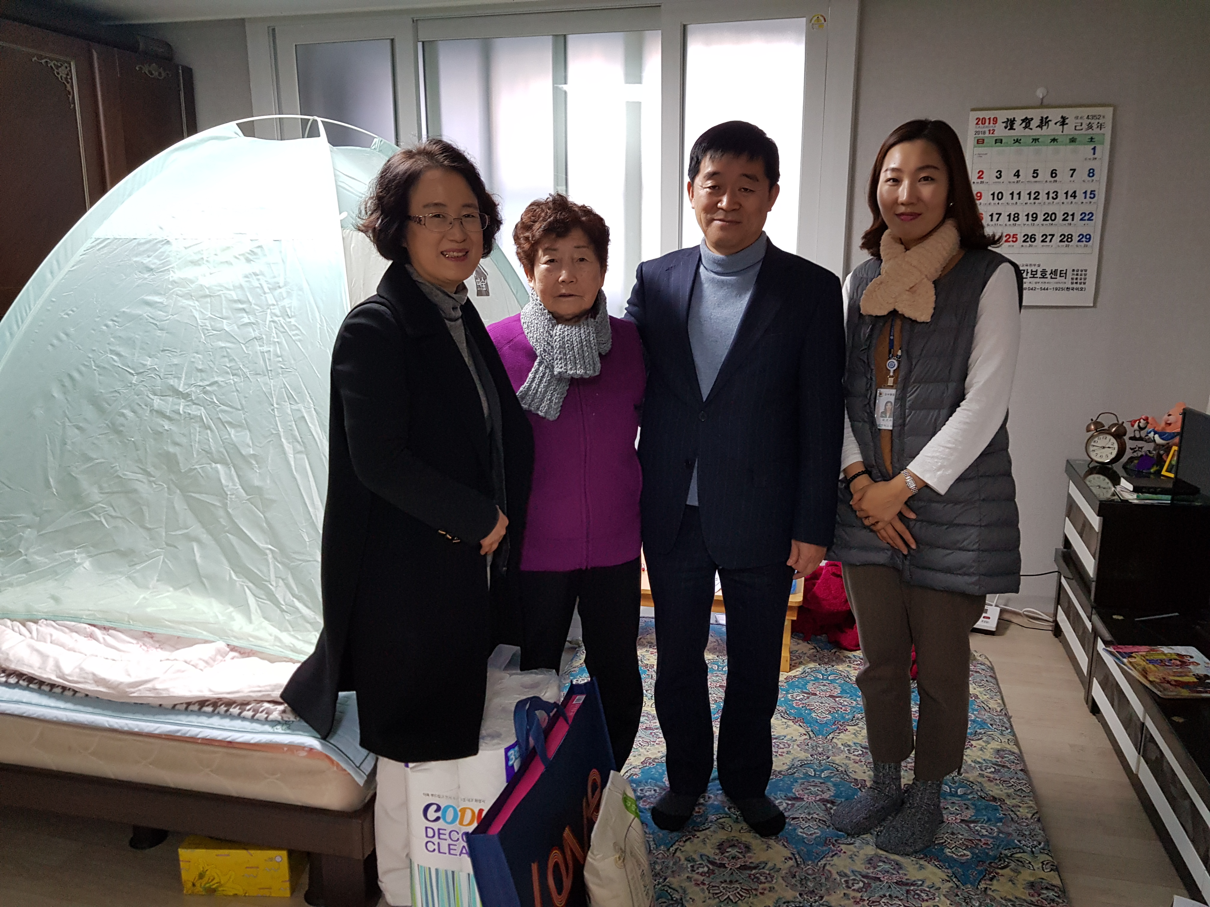 대전 유성구보건소(보건소장 신현정) 치매안심센터 관계자들이 24일 통계청 노동조합으로부터 후원받은 LED전등, 난방텐트, 생필품을 치매독거노인 및 치매가족에게 전달하고 있다. 유성구보건소 제공