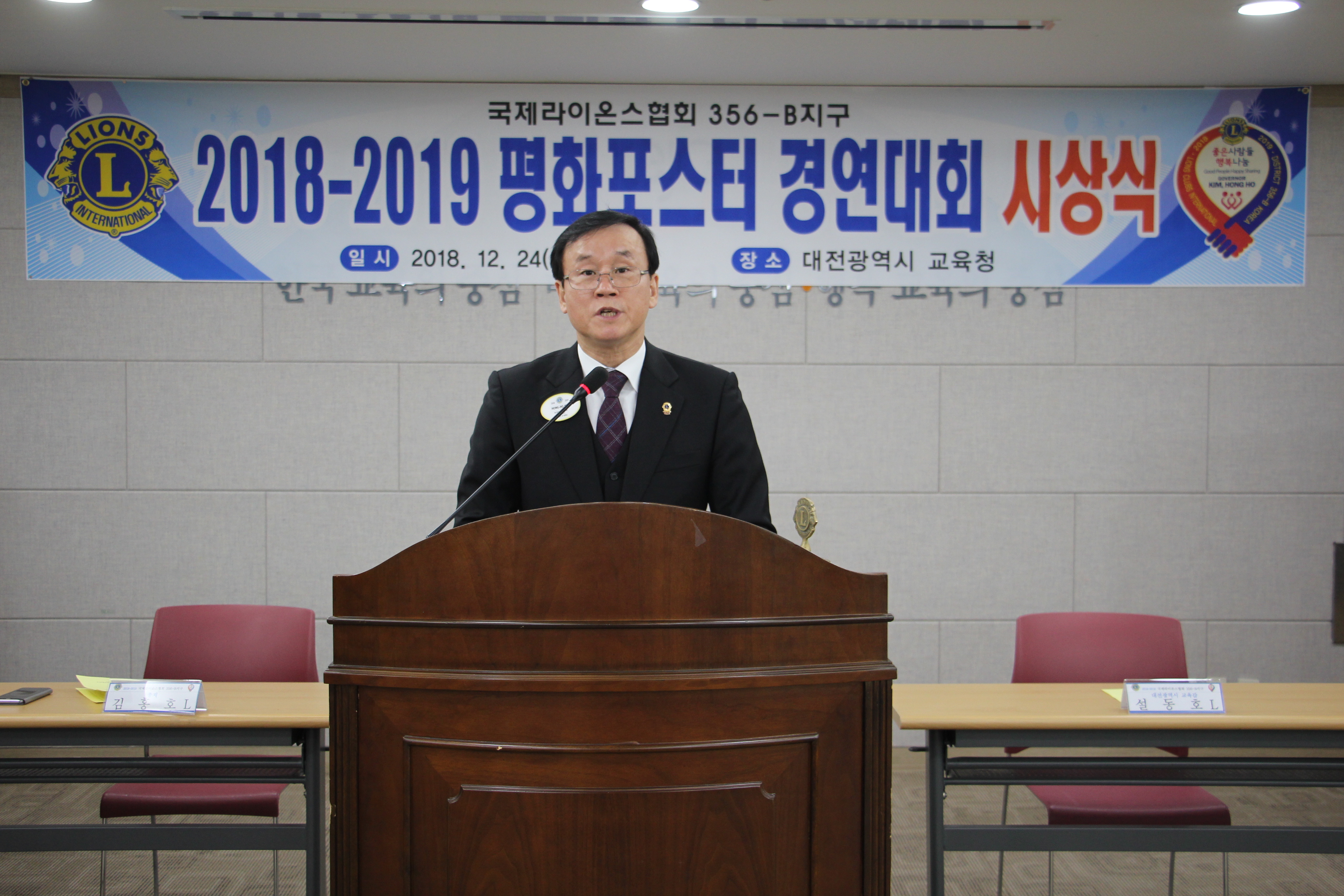 국제라이온스협회 356-B지구가 24일 대전교육청에서 ‘2018-2019 평화포스터 경연대회 시상식’을 개최한 가운데 김홍호 총재가 인사말을 하고 있다. 시상식에는 설동호 교육감을 비롯해 라이온스 임원진과 수상학생과 학부모 등 60여 명이 참여했다. 국제라이온스협회 제공