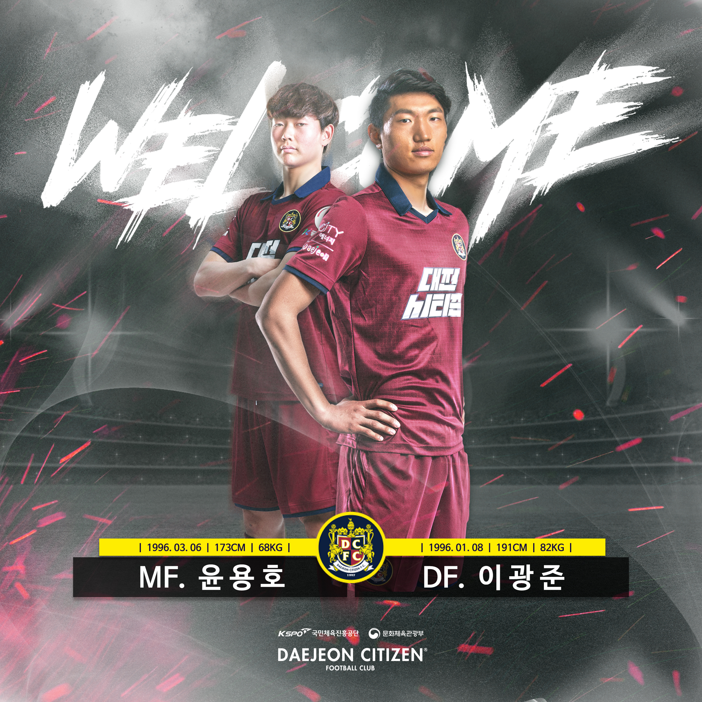 프로축구 대전시티즌이 미드필더 윤용호(수원삼성)와 수비수 이광준(포항스틸러스)을 임대 영입했다. 두 선수 모두 K리그 유스 출신으로 우선지명을 통해 프로에 입단했다.