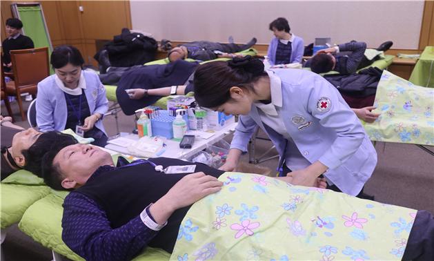 동절기 학생들의 방학 등으로 혈액수급이 어려운 시기에 대전시 공무원들이 혈액수급 안정화를 위해 발 벗고 나섰다. 대한적십자사 대전세종충남혈액원은 16일 대전시청 5층 ‘창의실’에서 채혈침대 6대를 운영해 사랑의 헌혈운동을 전개했다.