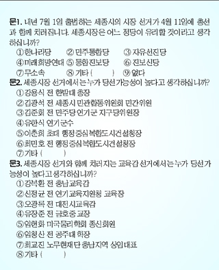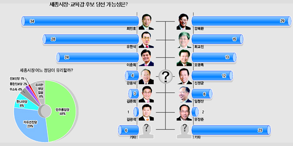 그러면서도 세종시장 당선 가능성이 높은 인물을 묻는 질문에는 34명이 한나라당 성향의 최민호 전 행정중심복합도시건설청장을 지목했다.