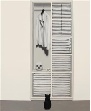 그럼 자연스럽게 우리의 눈은 옷장(관), 와이셔츠(수의), 해골(인간), 장식품(소모품)으로 쏠린다. 왜 작가는 이런 설정을 했을까. 우리의 눈에는 보이지 않지만 관, 수의, 인간, 소모품으로 바꾸어 읽힌다.