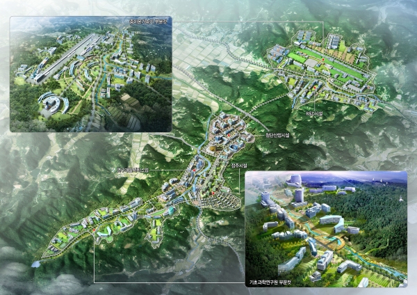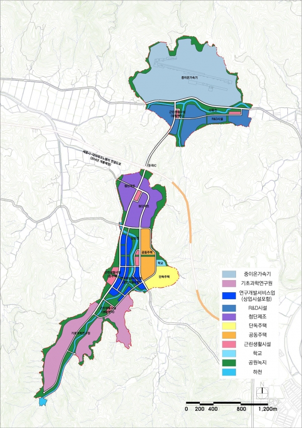 거점지구의 핵심 시설인 기초과학연구원(50만 6000㎡)과 중이온가속기(108만㎡)는 각각 둔곡지구 남쪽과 신동지구 북쪽에 들어선다. R&D시설과 첨단제조·연구개발서비스시설 등 산업시설은 과학-비즈니스 간 상호교류 활성화를 위한 접근성과 부지활용성을 고려해 거점 지구 중심부에 자리잡게 된다.