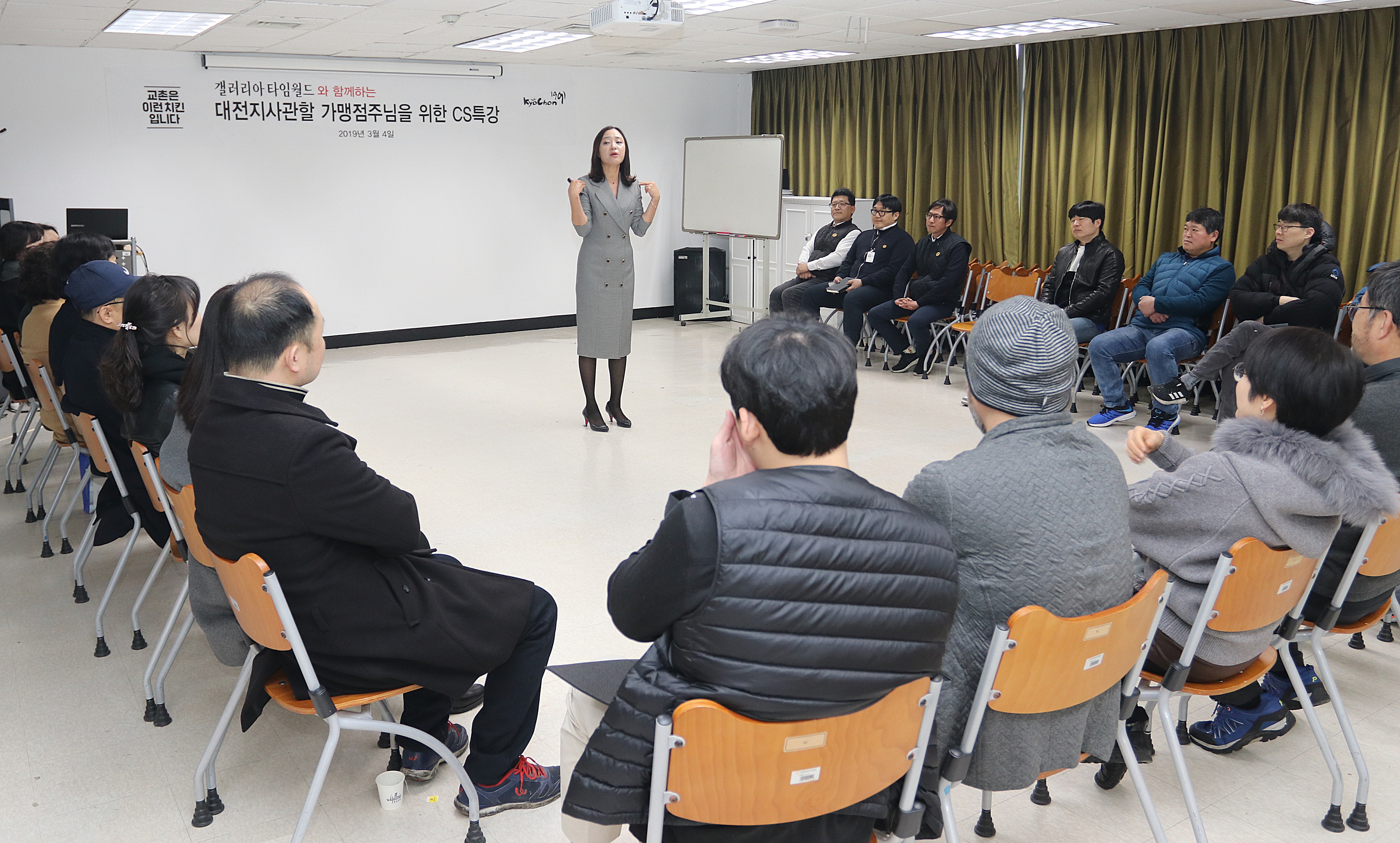 남은희 한화갤러리아타임월드 서비스교육강사가 4일 타임월드에서 지역 교촌치킨 점주를 대상으로 서비스교육을 하고 있다. 교육은 CS의 중요성, 고객만족기법, 고객과의 전화 상담 및 응대법, 매장에서의 인사 등으로 진행됐다. 갤러리아백화점타임월드 제공