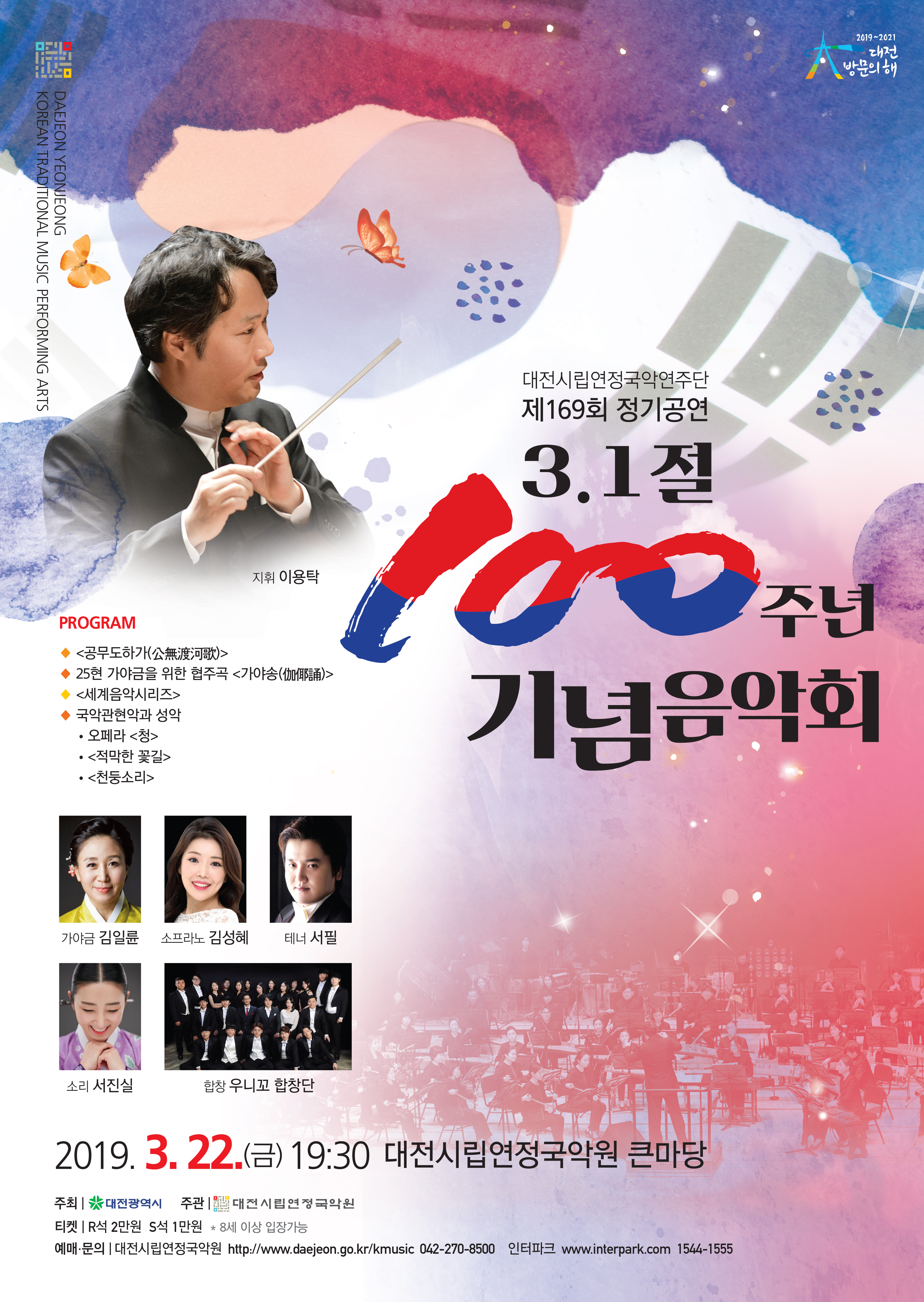 공연은 ‘3·1절 100주년 기념음악회’ 특징에 맞게 독립유공자와 유족들을 특별 초청해 애국지사들의 독립운동 정신을 기리는 의미를 더 할 예정이다. R석 2만 원, S석 1만 원이며, 자세한 내용은 대전시립연정국악원 홈페이지를 참고하거나 전화(042-270-8500)로 문의하면 된다.